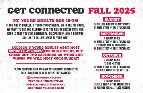 Through small groups and weekly gatherings, CrossPointe College Ministry exists to rally a generation around Jesus and each other. Our heart is for every college student to know, enjoy and glorify God through a personal relationship with Jesus Christ. Whether you’re a college student, young professional or still figuring it out, if you are between 18 and 25, CrossPointe College Ministry is for you.
