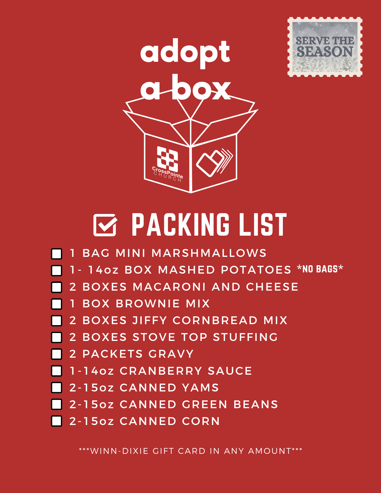 It’s that time of year again where THE CHURCH brings Thanksgiving dinner to those who could not otherwise have it. We are now accepting food to be put in our Adopt-A-Box Thanksgiving boxes. The last day to drop off food will be November 16th.